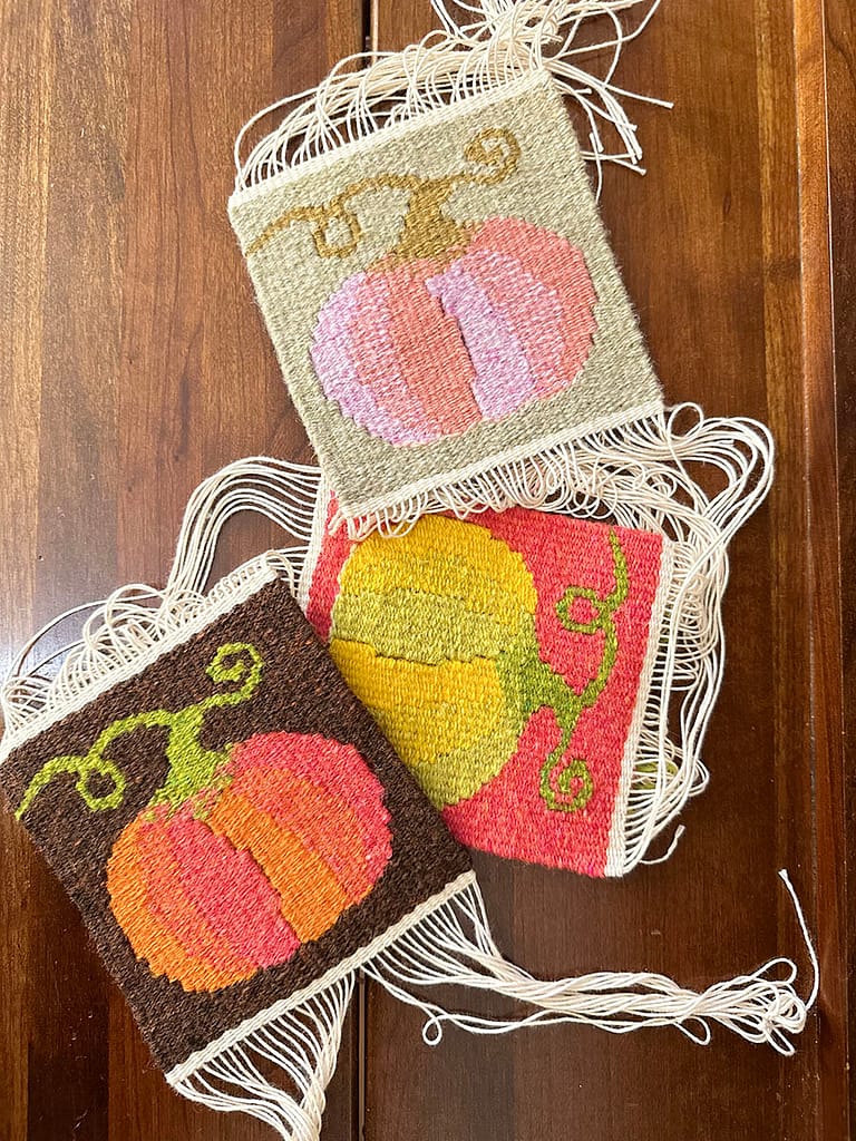 From the moment I started weaving, I couldn’t stop. Originally, I planned to finish just a couple of pieces, but with every weave, I discovered something new and it became more and more enjoyable. Before I knew it, I had woven five pieces, each with a different color scheme. Every one of them has its own unique character. Since I wove 5 pieces, it took much longer than I anticipated, but the satisfaction was well worth the effort.