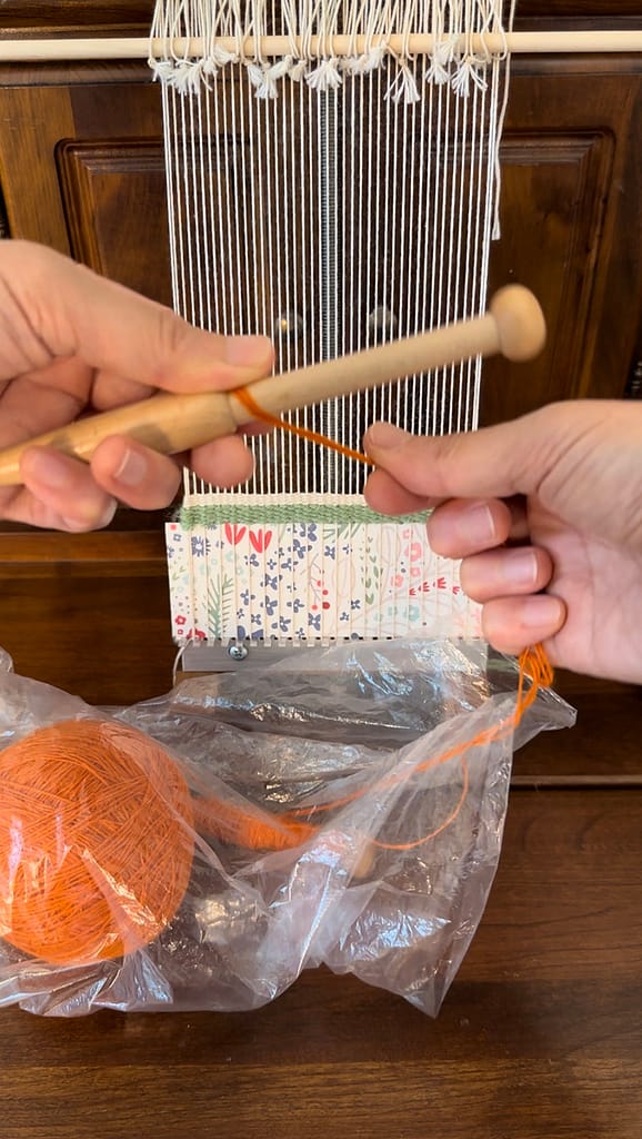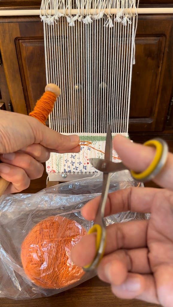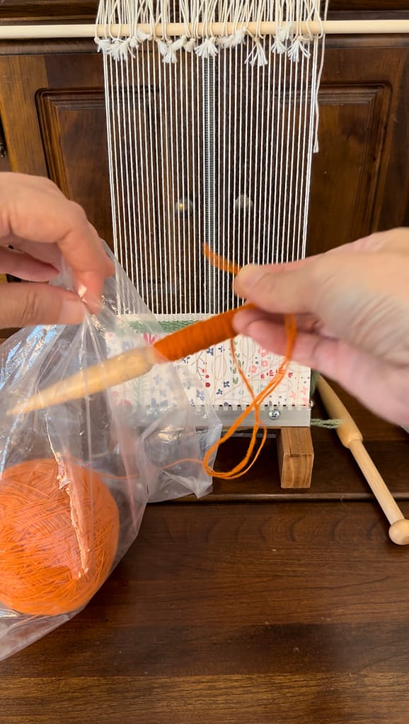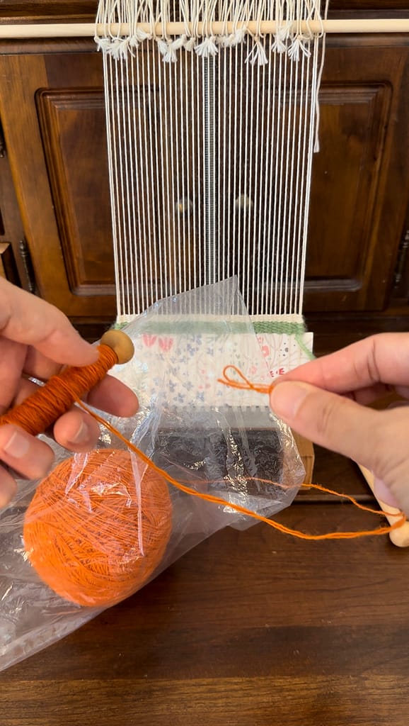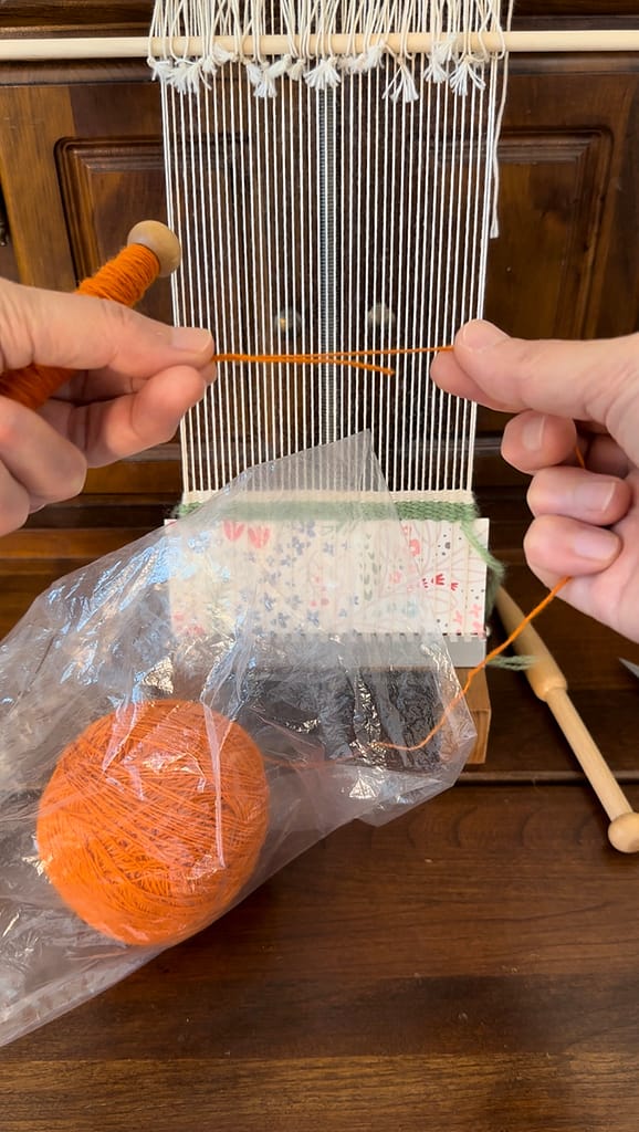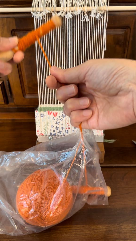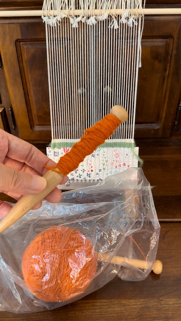 Put the weft in a plastic bag and measure the length of weft needed. This will be the first strand.