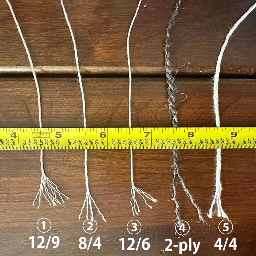 Warp #4 is a wool warp, no size number, twisted in two strands. It was sold under the label “Blanket Warp, Wool, 2 ply“.