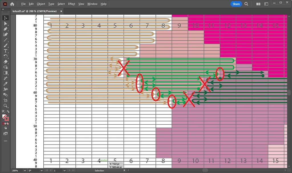 今回は、前回作ったラフなデザインを Adobe Illustrator を使って調整して、織りやすいデザインにしましょう。